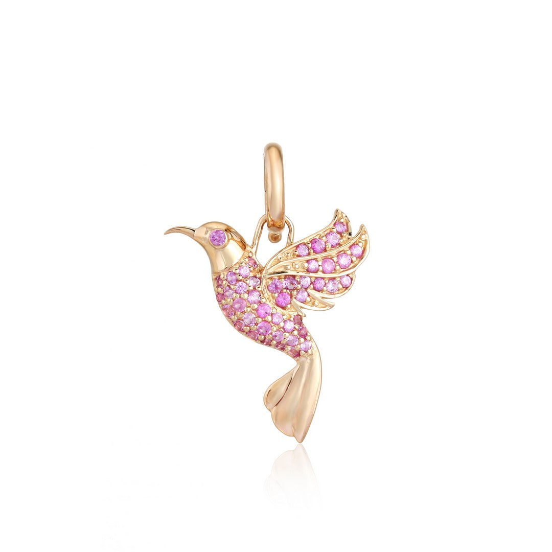Hummingbird charm pendant in 14K yellow gold, featuring blue sapphire, ruby, pink sapphire, and diamond accents. Measuring 19.5MM, this versatile piece combines precious gemstones with refined craftsmanship, perfect for charm or standalone wear.