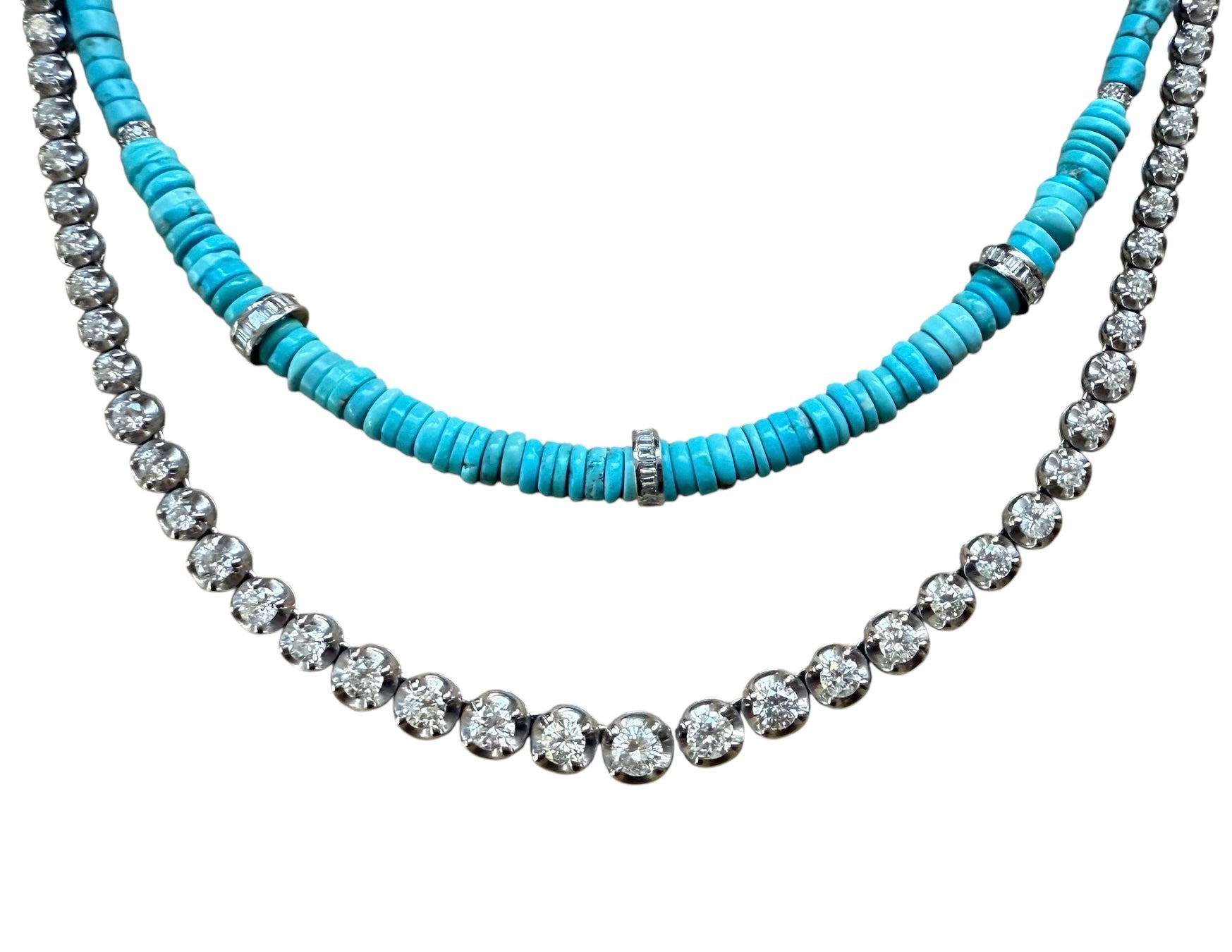 Crafted from 14K white gold, this daring Sleeping Beauty necklace features three baguette diamond rondelle, each 0.15 ct, alongside two smaller diamond rondelle adorned with five mini diamonds. The Heishi MMH1b beads measure 4mm in diameter and 2mm, strung just under 15.5” long. Sourced from the famed Sleeping Beauty Turquoise mine in Arizona—closed since 2012—this rare turquoise is renowned for its vivid, deep blue color inspired by the mountain range resembling a sleeping woman. This necklace boldly showcases one of the most captivating turquoise varieties available.
